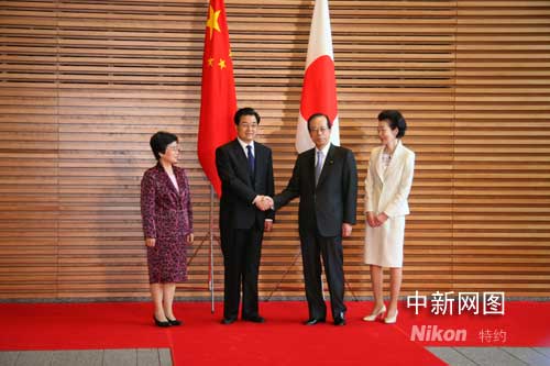 正在日本進(jìn)行國(guó)事訪問(wèn)的中國(guó)國(guó)家主席胡錦濤,5月7日上午與日本首相福田康夫舉行會(huì)談。圖為會(huì)談前,福田首相夫婦歡迎胡錦濤與夫人劉永清。中新社記者 齊彬攝