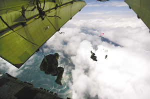濃霧翻滾,時(shí)機(jī)稍縱即逝。指揮員果斷下令:“跳!跳!跳!”頓時(shí),飛機(jī)尾門轟然張開,第一批7名隊(duì)員一躍而出!