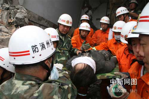 獲救者卞剛芬今年三十一歲,是鎣華實業(yè)公司的一名服務(wù)員,從被困至獲救,已經(jīng)過了整整一百二十四個小時,抗震救災(zāi)突擊隊是在十六日晚成功救出被困一百0四小時的青年工人李青松后,在一座五層樓房倒塌的廢墟中發(fā)現(xiàn)她的。