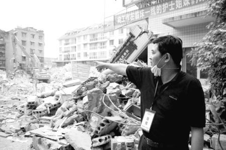何淼告訴記者,從5月12日16時,接到抗震搶險指揮部下達的任務到5月17日的六個白天五個夜晚,他90%的時間都在這里。記者問他:搜救工作進展如何?他說:“都江堰市中醫(yī)院住院部除骨科、婦科病房沒有垮塌外,其余科室的病房全部毀損性倒塌,被埋醫(yī)護人員有32人,病員及看護家屬100多人,因為看護人員沒有在冊,所以傷亡的具體數(shù)字不十分準確,只能估計!