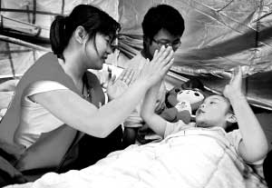 在中心醫(yī)院的大廳里,一個(gè)頭部受傷比較明顯的少年引起她的注意。她走上去,了解到這個(gè)名叫丁怡的男孩今年14歲,地震中頭部受傷,好在沒(méi)有傷到腦部,從容的交流,自然的表情讓黨育新覺(jué)得這個(gè)少年基本上沒(méi)有什么問(wèn)題,不過(guò)她仍然和這個(gè)少年交換了電話(huà),“我也是孤兒,你就和阿姨交個(gè)朋友吧。”