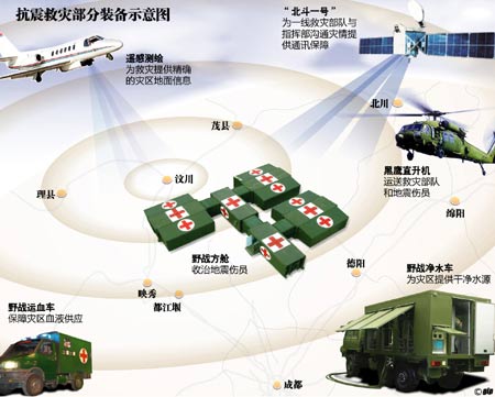 “北斗一號”、航測飛機、野戰(zhàn)醫(yī)療方艙、野戰(zhàn)運血車……這些帶有硝煙味道的軍事名詞,在連日來的四川抗震救災中大顯身手,發(fā)揮了不可替代的作用。