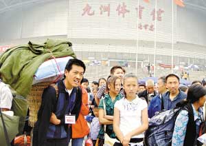 汶川大地震發(fā)生后,綿陽九洲體育館成了受災群眾的臨時安置點,數(shù)萬村民曾被轉移到這里。不過,昨天,記者在現(xiàn)場看到,幾十輛大巴正在將部分村民轉移出去,“我們是回家!北持罂、排著隊的村民說。