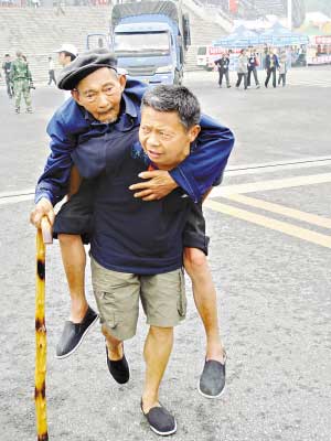 50歲的金光銀背著82歲的老父親金云才也來排隊。老人身體不好,腿腳不便,只有讓兒子背著走路。金光銀說:“政府都給我們安排好了,我們要轉移了!