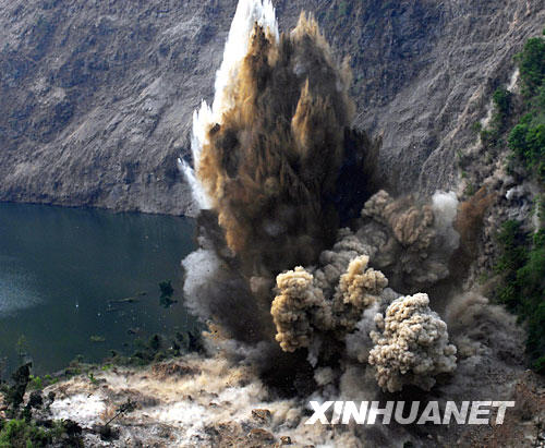 汶川地震發(fā)生后,青川縣青竹江石板溝一帶形成蓄水1200多萬立方米水的堰塞湖,威脅著下游數萬人安危,其中蓄水超過800萬立方米的石板溝堰塞湖被水利專家定為高危湖。隨著雨季來臨,高70多米的堤壩隨時都可能出現險情。為防止意外發(fā)生,武警水電三總隊對石板溝堰塞湖大壩實施了泄洪口爆破。