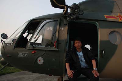 中新社攝影記者盛佳鵬等候直升飛機飛往災區(qū)