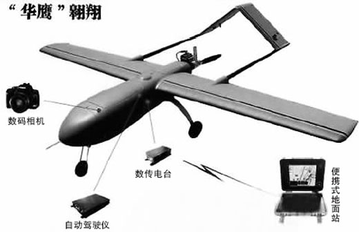 這款名為“華鷹”的無(wú)人機(jī)數(shù)次出現(xiàn)在青川、北川,對(duì)抗震救災(zāi)發(fā)揮了積極的作用。據(jù)四川省測(cè)繪局的專(zhuān)家介紹,“華鷹”是四川省測(cè)繪局專(zhuān)程向國(guó)家測(cè)繪局申請(qǐng)派來(lái)支援災(zāi)區(qū)的!叭A鷹”無(wú)人機(jī)航攝系統(tǒng)通過(guò)了國(guó)家測(cè)繪局鑒定,飛機(jī)系統(tǒng)采用GPS導(dǎo)航自主飛行,裝備專(zhuān)業(yè)數(shù)碼相機(jī),可在半徑15千米的范圍內(nèi)穩(wěn)定可靠飛行3小時(shí),自動(dòng)拍攝地面高分辨率航空影像,生成高清晰地面影像。