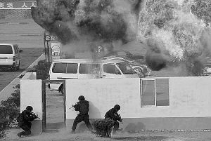 在指揮員下達(dá)攻擊令的余音聲中,突擊分隊(duì)兵分5路向目標(biāo)發(fā)起攻擊:從地下鉆出的特戰(zhàn)隊(duì)員,對大廳兩名歹徒實(shí)施了無聲射殺,迅速排除了出入口爆炸物,為救援行動打開了通道?罩写菇档奶貞(zhàn)隊(duì)員從天窗潛入“歹徒”所在的樓層,乘坐攀登突擊車的兩組隊(duì)員左右破窗,與空中垂降的戰(zhàn)友同時攻入大廳,“歹徒”未及反抗,就被一一擊斃或制服。樓頂?shù)奶貞?zhàn)隊(duì)員在對防護(hù)窗實(shí)施精確爆破后,利用繩索從天而降,破窗而入,身體騰空中,舉槍擊發(fā),“歹徒”未及反應(yīng),就已中彈斃命,人質(zhì)被安全解救。