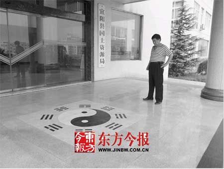 昨天下午,記者在河南宜陽縣國(guó)土資源局采訪時(shí)發(fā)現(xiàn),該局辦公大樓出口處的地板上鑲嵌有一幅碩大的黑色瓷磚八卦圖,該圖不但在整個(gè)平臺(tái)的正中央,而且恰好還處在辦公樓內(nèi)大廳的中軸線上。