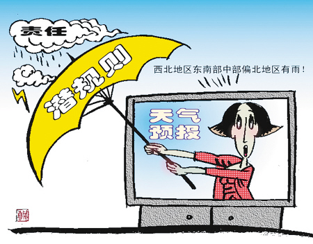 天氣預報曾被批為“四大不準”之首,原來氣象專家們學會了“太極拳”,啟用了“潛規(guī)則”,以一串模糊不清的詞語,讓百姓不知所云,自己無責一身輕了!這層窗戶紙被“業(yè)內(nèi)人士”捅破后,長期被忽悠、愚弄的觀眾忍不住發(fā)問:每天黃金時間播報,那么多經(jīng)費供養(yǎng),竟然貢獻出這樣的東東,這節(jié)目、這專家、這部門還要它干什么?的確,天氣預報不準確,百姓會很有意見,但即使報錯了,氣象部門也沒有哪個受到撤職或處分。民憤起于一時,但很快會歸為理性,作為“氣象人”,何必自作聰明用模糊語言忽悠民眾、罔顧己責呢?