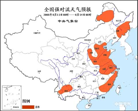 中新網(wǎng)8月13日電 據(jù)中國天氣網(wǎng)消息,中央氣象臺(tái)今晨六時(shí)繼續(xù)發(fā)布強(qiáng)對流天氣預(yù)報(bào):