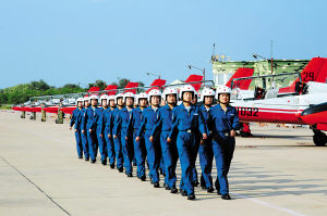 銀白色頭盔,天藍(lán)色飛行服,在紅白相間的戰(zhàn)鷹映襯下,整裝待發(fā)的女飛行學(xué)員顯得英姿颯爽!伴_(kāi)車(chē)!”隨著指揮員、飛行大隊(duì)長(zhǎng)孫光輝一聲令下,剎那間,發(fā)動(dòng)機(jī)轟鳴震天撼地,戰(zhàn)鷹依次滑進(jìn)跑道,以雷霆萬(wàn)鈞之勢(shì)直沖云天。