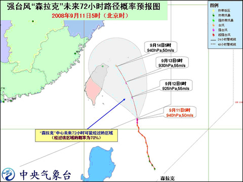 9月11日5時(shí)強(qiáng)臺(tái)風(fēng)“森拉克”未來72小時(shí)路徑概率預(yù)報(bào)圖