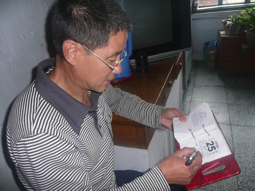 翟志強(qiáng)戴著花鏡計算著弟弟升入太空的時間。