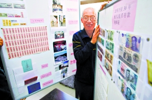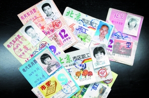 從2元的1995年版公交月票,到30元的2004年版公交月票,糧票、油票、工資條、彩票、選民證等,柯富海老人的100多件收藏品,在西花市大街南里居委會林林總總擺滿了三面墻。這是一位花甲老人的“個人改革開放30周年展”。