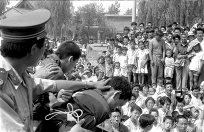 同時,留在人們集體記憶中的,還有公判大會。劉仁文說,當(dāng)時被押到現(xiàn)場的犯罪分子,戴著畫了大紅叉的木牌,垂頭喪氣,聽候著聲勢浩大的審判。臺下,上萬名群眾都在圍觀,人們竊竊私語,“這不是誰誰家的兒子嗎?聽說搶了幾千塊錢,被判死刑了!