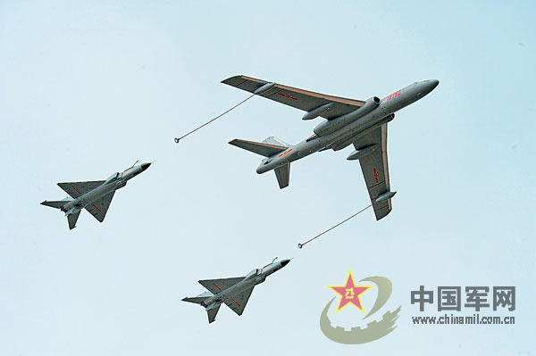 率先登場(chǎng)的是轟油—6空中加油機(jī)。遠(yuǎn)遠(yuǎn)望去,只見3個(gè)黑點(diǎn)成“品”字形向觀眾區(qū)飛來。不一會(huì)兒,飛在前面的轟油—6空中加油機(jī)伸出兩根錐套式軟管,兩架殲—8D戰(zhàn)斗機(jī)略一加速縮短與加油機(jī)的距離,到約1米間隔時(shí)保持住速度,緊緊跟隨在加油機(jī)左右兩側(cè)。望著在500米高度上慢速飛來的加受油機(jī)編隊(duì),現(xiàn)場(chǎng)觀眾雖然知道空中的飛行員根本聽不到地面上的聲響,但仍然報(bào)以熱烈的掌聲。