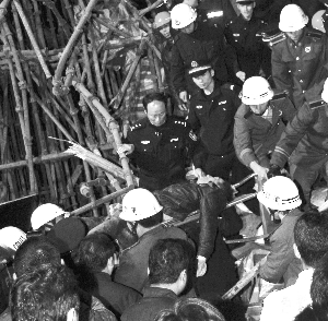 晚上8點多,搜救人員終于確定了被埋者的位置,但由于腳手架之間全是土,加上腳手架大都嚴(yán)重變形,給救援帶來了很大不便。