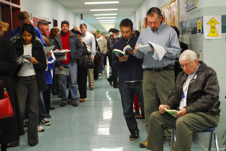等到孩子們真正長(zhǎng)大可以投票的時(shí)候,他們?cè)跓崆楦邼q的同時(shí)又不乏理性。在呂芳的想像中,投票站應(yīng)該是兩方對(duì)壘,支持者搖旗吶喊才對(duì)。結(jié)果卻完全出乎他的預(yù)料。大選當(dāng)天,呂芳所在小組參觀的第一個(gè)投票點(diǎn)在弗吉尼亞Falls Church縣的一個(gè)社區(qū)活動(dòng)中心。他們到那里時(shí)剛過(guò)6點(diǎn),投票點(diǎn)外已經(jīng)排起了長(zhǎng)龍,蜿蜒足有一二百米。人群中,有人帶著蹣跚學(xué)步的孩子,有人坐著輪椅,有人自己帶著椅子……“但是,整個(gè)人群靜悄悄的,沒(méi)有一點(diǎn)激動(dòng)人心的表現(xiàn)!