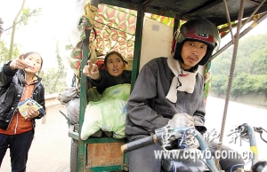 三輪車隊不得不重返210國道。四輛三輪車上,包括司機,共搭載了11人。一輛車便是一個家庭單元:夫妻或者父母兒女。一行人上月18日從廣東出發(fā),一路經(jīng)廣西、貴州,到昨日,已奔波了14天。