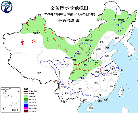 2008年12月2日8時—12月3日8時全國降水量預報圖