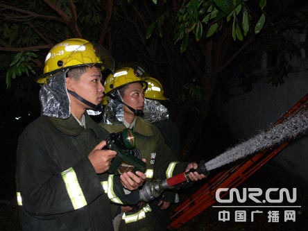 根據(jù)現(xiàn)場情況,中隊(duì)指揮員立即向支隊(duì)“119”調(diào)度指揮中心請求增援,并果斷下達(dá)作戰(zhàn)命令,一臺(tái)消防車?吭谥评滠囬g的圍墻外,鋪設(shè)水帶出兩支水槍向制冷車間射水控制火勢,另一臺(tái)消防駛?cè)霃S區(qū)大門口內(nèi)部,?吭谀媳苯,消防官兵身穿防化服,佩戴空氣器在工廠技術(shù)人員的帶領(lǐng)下深入制冷車間門口進(jìn)行滅火和稀釋泄漏的氨氣。另兩臺(tái)消防車負(fù)責(zé)供水,并進(jìn)行現(xiàn)場的疏散和警戒。