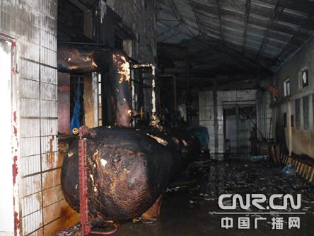 火災(zāi)過后,車間內(nèi)一片狼籍,部分氨氣管道外已結(jié)冰,在車間,技術(shù)人員經(jīng)過檢查,發(fā)現(xiàn)的連接氨氣的電機(jī)制冷機(jī)一個(gè)蓋子“爆了”,技術(shù)人員稱爆炸就是從這里產(chǎn)生的。