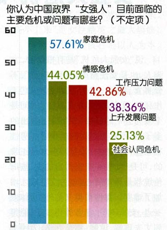 在回答“中國政界‘女強(qiáng)人’目前面臨的主要危機(jī)或問題有哪些?”時(shí),57.61%的受調(diào)查者選擇“家庭危機(jī),如沒有時(shí)間照顧家人帶來的問題”,44.05%的受調(diào)查者選擇“情感危機(jī),如夫妻情感難以和諧”,42.86%的受調(diào)查者選擇“工作壓力問題,甚至導(dǎo)致身體健康狀況堪憂”,38.36%的受調(diào)查者選擇“上升發(fā)展問題,如‘女強(qiáng)人’多擔(dān)任副職”。