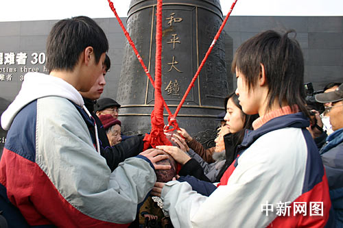 南京大屠殺幸存者、青少年代表撞響和平大鐘。