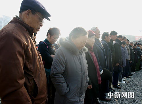冬日的南京顯得陰冷。早上十時(shí),警報(bào)聲中,聚集在紀(jì)念館悼念廣場(chǎng)的三千軍民低首默哀三分鐘,并向遇難同胞三鞠躬。