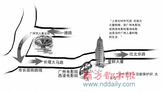離開兒童公園,張廣寧沿人民南路向南走去。當看到廣州電影院和西濠電影院的招牌時,張廣寧還回憶說,上世紀90年代前,在南方大廈購物、到廣州電影院或西濠電影院看場電影,這是當時廣州人最時髦的生活。眼前,廣州電影院已變成一家KTV,而西濠電影院則變成了一家網(wǎng)吧。見此情此景張廣寧立即要求致電主管部門,了解這幾家老字號的產(chǎn)權及消失原因。
