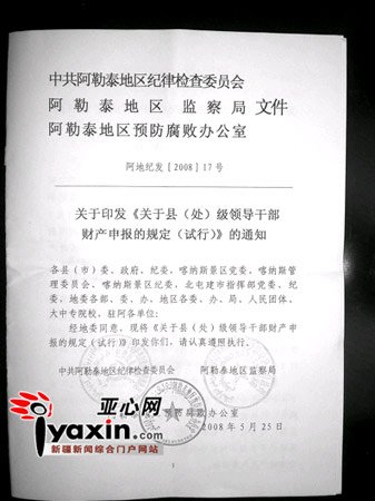 阿勒泰地區(qū)官員的財產(chǎn)申報制度,始于去年5月的一份《縣(處)級領(lǐng)導(dǎo)干部財產(chǎn)申報的規(guī)定(試行)》(下稱《規(guī)定》)。這份文件的起草人和主推者即吳偉平。