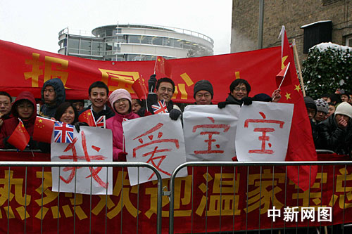 中新網(wǎng)倫敦2月2日電(記者 張朔)當(dāng)?shù)貢r(shí)間二月二日下午,即將結(jié)束訪英和訪歐行程的中國總理溫家寶踏雪到訪劍橋大學(xué),受到學(xué)子們的熱烈歡迎。有的學(xué)生甚至還打出了中文標(biāo)語:“我愛寶寶。”
