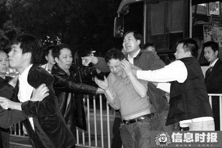 在現(xiàn)場,記者看到該名穿淺紅色衣服的男子在不停打電話,該名男子身高大概1米65左右,情緒暴躁,揮舞手臂。在接受警方調(diào)查時,該名男子忽然一拳將旁邊面包車司機(jī)的兒子陳家文打倒在地。隨后還推開前來執(zhí)勤的交警。“你們?nèi)枂,知不知道我是誰?”該名男子向人群叫囂,現(xiàn)場一片混亂。 (信息時報)