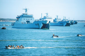“按新大綱施訓(xùn),聯(lián)合是個(gè)重頭戲。但是,以往高層指揮機(jī)構(gòu)聯(lián)訓(xùn)較多,基層部隊(duì)聯(lián)訓(xùn)不夠。這種做法,容易造成聯(lián)合訓(xùn)練‘有想法沒(méi)辦法’,使得基層部隊(duì)聯(lián)訓(xùn)就像捆籬笆,拴在一起也是貌合神離,經(jīng)不起風(fēng)雨。今年按綱施訓(xùn),我們力求解決這個(gè)問(wèn)題,大力提高一線(xiàn)指戰(zhàn)員的聯(lián)合素質(zhì)!蓖踔ш(duì)長(zhǎng)話(huà)音剛落,只見(jiàn)熒屏上出現(xiàn)精彩一幕:登陸艦抵達(dá)泛水點(diǎn),帆纜業(yè)務(wù)長(zhǎng)、四級(jí)士官羅曉春組織帆纜兵開(kāi)大門(mén)、展吊橋,指揮兩棲坦克泛水;當(dāng)?shù)顷懕粨舻顷憰r(shí),遭到“敵”灘頭火力猛烈阻擊,“海洋山”艦艦長(zhǎng)鄧先武果斷命令艦炮進(jìn)行火力支援,發(fā)發(fā)炮彈將“敵”地堡掀上半空……