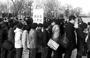 昨日上午9時許,雖然招聘現(xiàn)場內(nèi)人流量并不大,但在場外,蜿蜒的求職隊伍已排1千多米長。主辦方表示,從早晨7時就有人拿著簡歷和早餐在門口等候了。此次招聘會規(guī)定只有碩士研究生學(xué)歷以上和有工作經(jīng)驗的人才有資格參加,所以隊伍中不乏北大、清華、人大的高材生和“海歸”。招聘會設(shè)置了資格驗證環(huán)節(jié),不符合條件者不能進(jìn)場。
