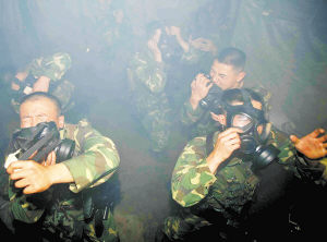 2月12日上午,廣州軍區(qū)某部組織共同課目考核。連長(zhǎng)張履宏指著一個(gè)大帳篷說(shuō):“這就是防化訓(xùn)練的‘染毒地域’!钡,戰(zhàn)士們并不緊張,一名老兵悄悄告訴記者:“里面不是真的毒氣,是煙霧!