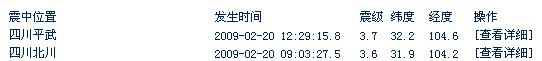 據(jù)地震臺(tái)網(wǎng)測(cè)定,北京時(shí)間2009-02-20 12:29:15.8在四川平武(北緯32.2,東經(jīng)104.6)發(fā)生3.7級(jí)地震。