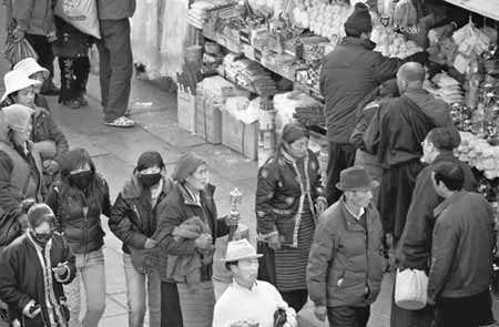 陽(yáng)光下的拉薩顯得溫暖而平和,在熱鬧的八角街,朝圣者的腳步依舊匆匆,大大小小的商鋪依舊熱鬧。74歲的藏族老人益西洛追住在夏薩蘇社區(qū),他喜歡每天到八角街上走一走,感受這里的繁華。經(jīng)歷過(guò)新舊兩個(gè)西藏的益西洛追,在這條街上最能感受到時(shí)代變遷的真正含義。
