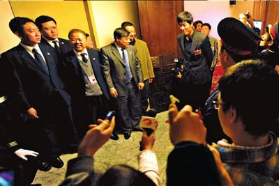小組討論還未開始,21世紀飯店三樓第七會議室門口已擠了上百名記者。由于會議室太小、記者太多,大家都不能進去旁聽。攝影和攝像記者10人一組,3分鐘一輪,進場拍攝;而文字記者則只能將錄音筆送進會場。會議室里一下子放了30多個錄音筆。