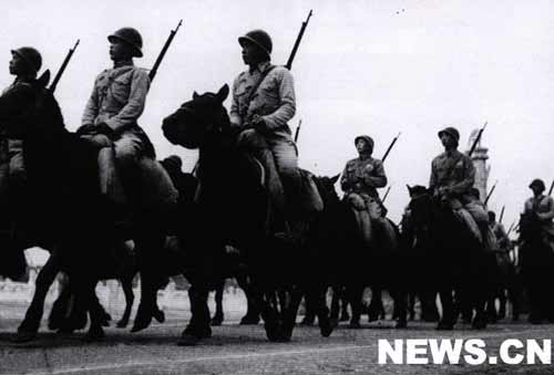 毛主席宣讀公告完畢,閱兵式開始。閱兵式由人民解放軍朱德總司令任檢閱司令員,華北軍區(qū)司令員兼京津衛(wèi)戍區(qū)司令員聶榮臻將軍任閱兵總指揮。朱總司令驅(qū)車檢閱各兵種部隊(duì),回到主席臺上宣讀人民解放軍總部命令。受閱部隊(duì)隨即分列經(jīng)主席臺前由東向西行進(jìn),前后歷時(shí)三小時(shí)。受閱部隊(duì)以海軍兩個(gè)排為前導(dǎo),接著是一個(gè)步兵師、一個(gè)炮兵師、一個(gè)戰(zhàn)車師、一個(gè)騎兵師,相繼跟進(jìn)?哲姲☉(zhàn)斗機(jī)、運(yùn)輸機(jī)、教練機(jī)共十四架在全場上空自東向西飛行受閱。在閱兵式中,全場掌聲象波浪一樣,一個(gè)高潮接著一個(gè)高潮。