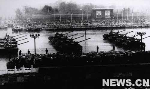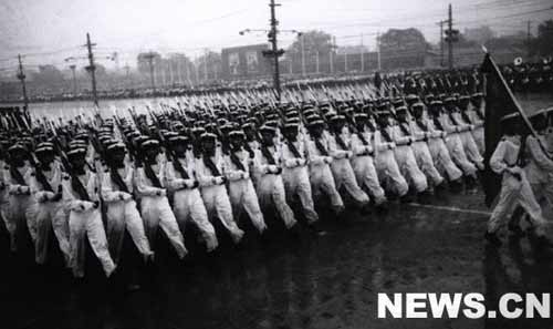 接著,分列式開始。軍事學院、步兵學校、炮兵學校、工程兵學校、坦克學校、航空學校、海軍學校的隊伍和水兵、公安軍、步兵師、摩托化步兵、傘兵、炮兵部隊、坦克部隊相繼通過了天安門廣場。
