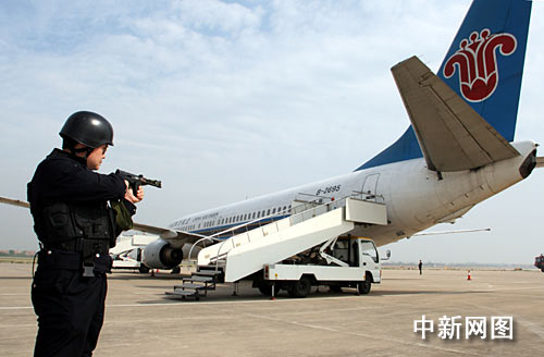 此次演練設(shè)計的緊急狀況,是某航空公司的2222航班正飛越武漢上空時,突然有兩名不明身份的歹徒用刀脅制四名旅客,并向飛機(jī)駕駛室逼近,企圖劫持飛機(jī)。