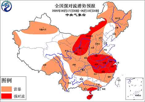 中新網(wǎng)6月17日電 中央氣象臺18時發(fā)布強對流天氣預報,預計今天夜間到明天白天,新疆北部和西南部、西北地區(qū)東部、內(nèi)蒙古大部、華北大部、東北大部、青藏高原東部、西南地區(qū)西南部和東北部、黃淮大部、湖北、江淮、江南大部、華南中南部等地將有雷暴天氣,其中,甘肅東部、寧夏、陜西北部、內(nèi)蒙古中東部地區(qū)局地有冰雹、短時強降水、雷雨大風等強對流天氣,河南南部、安徽、江蘇大部、湖北大部、湖南東北部、江西北部、浙江、上海、福建北部、廣西東南部、廣東西南部、海南局部有短時強降水、雷雨大風等強對流天氣。