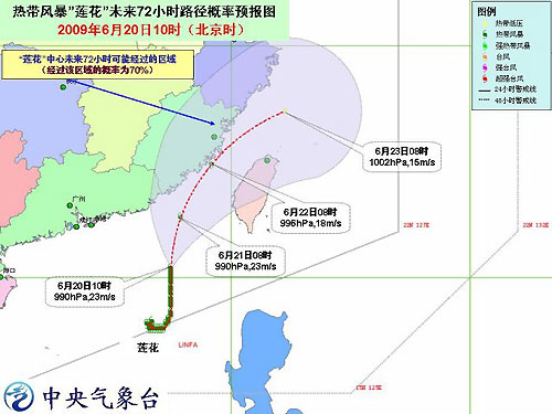 中新網(wǎng)6月20日電 中央氣象臺(tái)今天上午十時(shí)發(fā)布臺(tái)風(fēng)橙色警報(bào):今年第 3 號(hào)熱帶風(fēng)暴“蓮花”( LINFA )的中心今天上午 10 時(shí)位于東沙島東偏南方大約 60 公里的南海北部海面上,就是北緯 20.5 度,東經(jīng) 117.5 度,中心附近最大風(fēng)力有 9 級(jí)( 23 米 / 秒)。