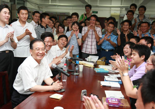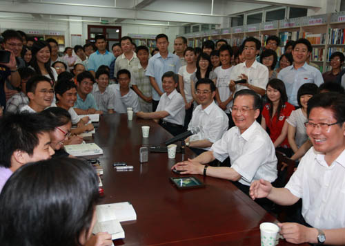 溫家寶:我非常高興來(lái)到湖南大學(xué),看望廣大師生,我向你們表示問(wèn)候。湖南大學(xué)是千年學(xué)府、百年名校,為國(guó)家培養(yǎng)了許多棟梁之才,這是你們的光榮!你們身上承擔(dān)著很重的責(zé)任。我想引用一位詩(shī)人的名言,他叫布朗寧,他曾經(jīng)說(shuō):“我心寄托在什么地方,讓我腦也就寄托在那里!蔽覀儑(guó)家的未來(lái),寄托在青年學(xué)生的身上,寄托在年輕一代!因此,我來(lái)到年輕人中間,腦子里的寄托也就是希望跟你們說(shuō)幾句心里話。我希望你們懂得奮斗,準(zhǔn)備迎接困難。青年學(xué)生是富于理想的,這是你們的優(yōu)勢(shì),但是人生的道路是不平坦的,你們要以徹底的覺悟、不屈不撓的意志和艱苦的努力,去面對(duì)和迎接這些困難。我相信,你們都有遠(yuǎn)大的理想,但是還要腳踏實(shí)地。你們經(jīng)過(guò)幾年的學(xué)習(xí),即將走向社會(huì),要記住六個(gè)字,就是“此時(shí)、此地、此身”!按藭r(shí)”,就是現(xiàn)在應(yīng)該做的事情,就立即做起來(lái),不要拖延到以后;“此地”,就是要在你所處的崗位做起,為國(guó)家和人民作出貢獻(xiàn),不要等到別的地方;“此身”,就是自己應(yīng)該而且能夠做的事情,就要勇于承擔(dān),不要推給別人。