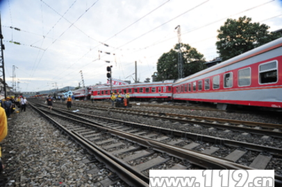 經(jīng)偵查得知,此次列車(chē)相撞事故是由K9017次列車(chē)撞上了稍前脫軌的K9063列車(chē),K9017次列車(chē)?yán)^而撞上了旁邊民房。事故發(fā)生地為飛虹橋道口,現(xiàn)場(chǎng)約70人受傷,發(fā)現(xiàn)3人遇難。支隊(duì)全勤指揮部立即將參戰(zhàn)官兵分成2組,分別對(duì)2列相撞火車(chē)和民房被困人員展開(kāi)救援,一組負(fù)責(zé)民房倒塌處的工作,一組負(fù)責(zé)相撞列車(chē)的救援工作。第一組官兵冒著民房再次塌方的危險(xiǎn),采用減擴(kuò)器、撬棍、切割機(jī)、人工手挖等方式救出4人,挖掘出1具尸體。另一組官兵負(fù)責(zé)列車(chē)救援工作,因車(chē)廂嚴(yán)重扭曲變形,參戰(zhàn)官兵采用撬棍、起重氣墊、液壓撐頂器、千斤頂?shù)裙ぞ邠伍_(kāi)列車(chē)變形部分,戰(zhàn)士們冒著車(chē)廂隨時(shí)可能再次坍塌的危險(xiǎn)為被困乘客打開(kāi)生命通道。