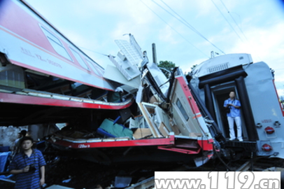 6月29日2時(shí)33分許,湖南公安消防總隊(duì)郴州市消防支隊(duì)指揮中心接到報(bào)警:飛虹橋道口兩列客運(yùn)火車(chē)相撞(K9017次列車(chē)撞上了稍前脫軌的K9063次列車(chē)),其中一列撞上附近一民房,請(qǐng)求救援。