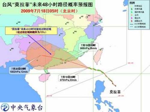該警報預(yù)計,“莫拉菲”將以每小時20-25公里的速度向西偏北方向移動,將于18日夜間到19日上午在廣東惠來到臺山一帶沿海登陸,登陸后強度將迅速減弱。