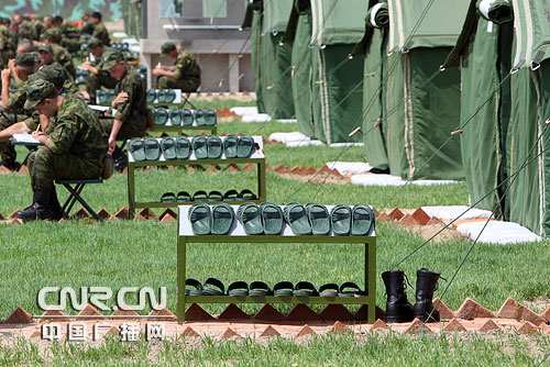 鳳凰衛(wèi)視記者:打靶歸來,第一件事情當(dāng)然是洗澡,不過這樣赤條條穿過軍營,在中國記者眼中實(shí)在是過于自由散漫,看來紀(jì)律嚴(yán)明的俄羅斯大兵,訓(xùn)練歸訓(xùn)練,生活還是生活,由中方承建的俄軍野營村,規(guī)模不大,但功能齊全,熨斗、網(wǎng)吧、電話亭,各種生活設(shè)施一應(yīng)俱全,面積達(dá)2750平方米的大食堂,每天都為1300名俄羅斯官兵,提供最地道俄式餐飲,雖然食物原料由中國制造,但17位廚娘清一色都來自俄羅斯,超市內(nèi)琳瑯滿目,應(yīng)有盡有,每一份商品都用中文和俄文注明詳細(xì)的價(jià)格,超市東西雖然便宜,還是要用人民幣來購買,所以俄羅斯士兵大都要到這里的貨幣兌換處來把手中的盧布換成人民幣,每100盧布,可以換19元人民幣。兌換處經(jīng)常大排長龍,但精通俄語的中方工作人員就說,開業(yè)一周以來,這里每天的交易額只是3萬盧布,折合人民幣6300元平均每人每天才兌換5塊錢,不知道是俄軍待遇差,還是俄羅斯經(jīng)濟(jì)衰退的緣故呢?